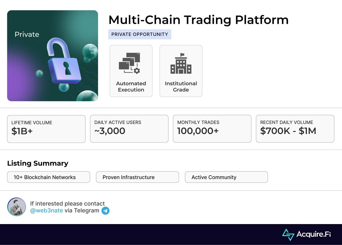 A well-established automated trading bot and platform built for institutional-grade execution across 10+ blockchain networks is available for acquisition. With over $1 billion in lifetime trading volume and recent daily volumes between $700k-1M, the platform has demonstrated consistent traction with approximately 3,000 daily active users generating 100,000 trades monthly.