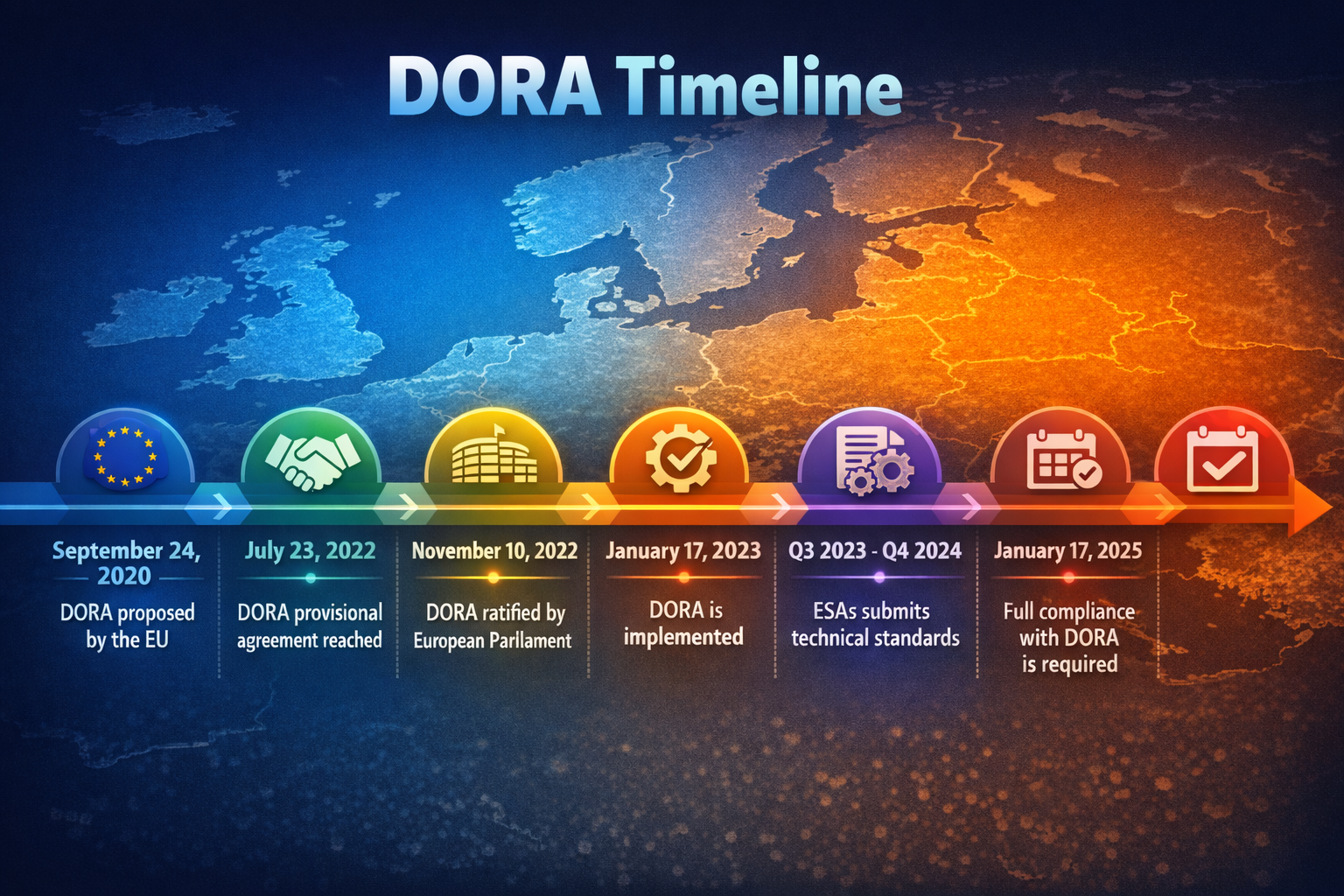 So in 2020, the European Commission drafted DORA. It was adopted in 2022, entered into force in January 2023, and gave businesses two years to prepare before the January 17, 2025, compliance deadline.